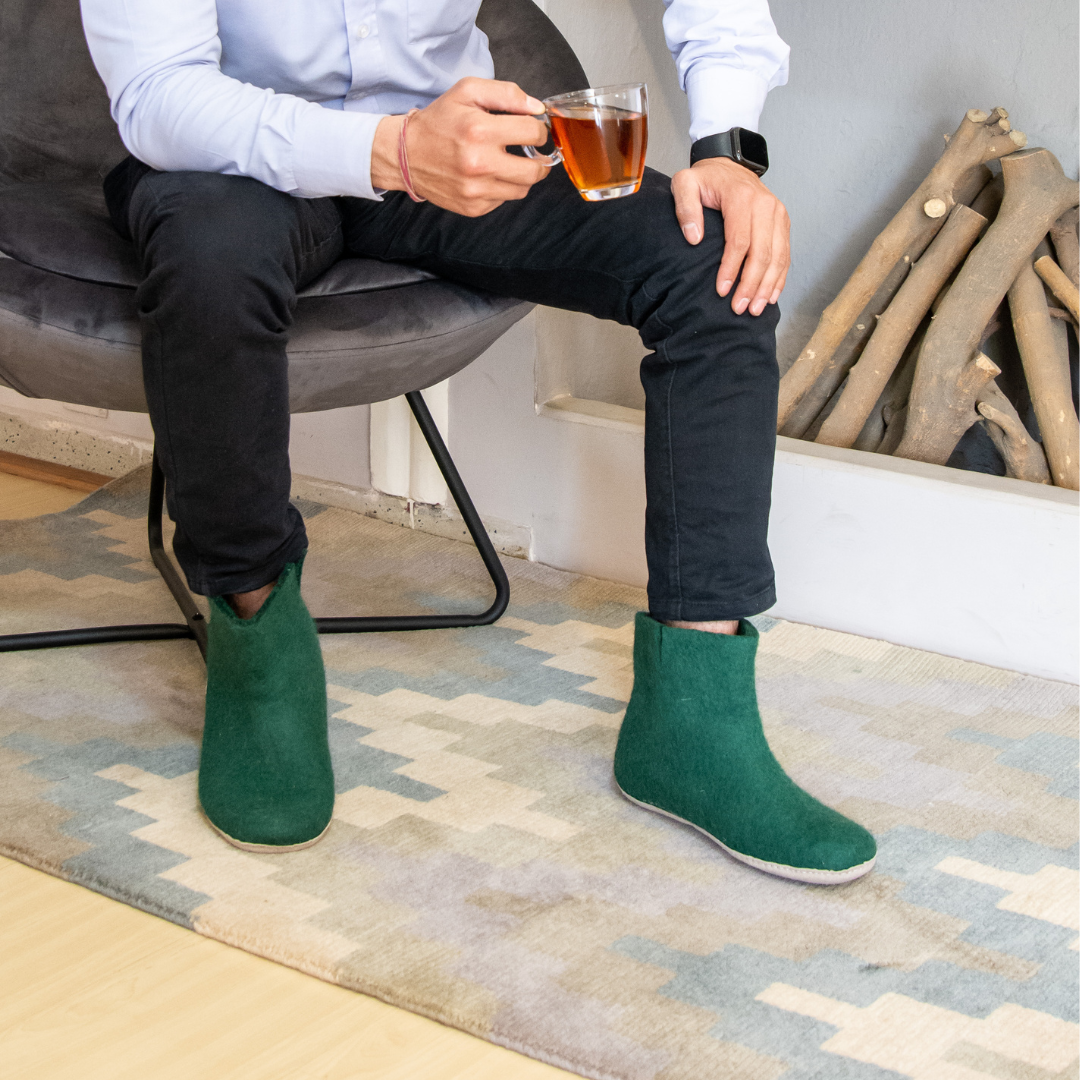 Forest Green Handmade Wool Felt Indoor Boot with Leather Sole